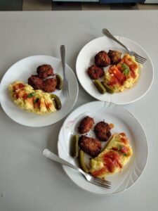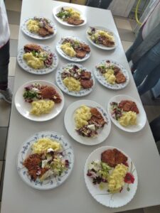 Pofticiosii mari si mici sunt invitati la masa: Preparat de baza: Șnițel din mușchi de porc cu piureu și salată mix. Desert -Tiramisu cu portocale.